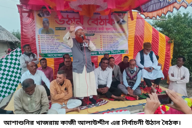 শিবপদ মন্ডলের সভাপতিত্বে বৈঠকে প্রধান অতিথি হিসাবে বক্তব্য রাখেন, বিএনপি মনোনীত ধানের শীষের প্রার্থী, বিএনপি কেন্দ্রীয় নির্বাহী কমিটির সদস্য সাবেক এমপি আলহাজ্ব কাজী আলাউদ্দীন। প্রধান অতিথির বক্তব্যে তিনি বলেন, এই এলাকার সনাতন ধর্মাবলম্বীদের মাঝে এসেছি, আপনাদের জীবন মান, রাস্তাঘাট, পরিবেশ সবকিছু দেখলাম। আমি নির্বাচিত হতে পারলে সবকিছুর পরিবর্তন আনবো। আমি কালিগঞ্জ ও দেবহাটা আসনে এমপি ছিলাম। সে সময় আমি এলাকার সকল অবকাঠামো, রাস্তাঘাট, স্কুল কলেজ মাদ্রাসা, কালভার্ট, সকল কাচা রাস্তার পাকা করেছিলাম। আমি মুক্তিযুদ্ধ চলাকালে আশাশুনির অলিতে গলিতে যুদ্ধ করেছিলাম, আন্দোলনের সময় অনেক দিন আশাশুনিতে কাটিয়েছি। আমি এমপি নির্বাচিত হলে আশাশুনির কোন রাস্তা কাচা থাকবেনা, মসজিদ মন্দির, স্কুল কলেজ বিদ্যুৎ এর উন্নয়ন করা হবে। বেড়ী বাঁধ বিশ্বের সব চেয়ে টেকসই করা হবে। আশাশুনিতে ইকোনমিক জোন সৃষ্ঠি করবো। ১০০ শয্যা বিশিষ্ট হাসপাতাল করবো। এক বছরে সকল রাস্তা পাকা করবো। তাঁত ও কুঠির শিল্প গড়ে তুলবো।