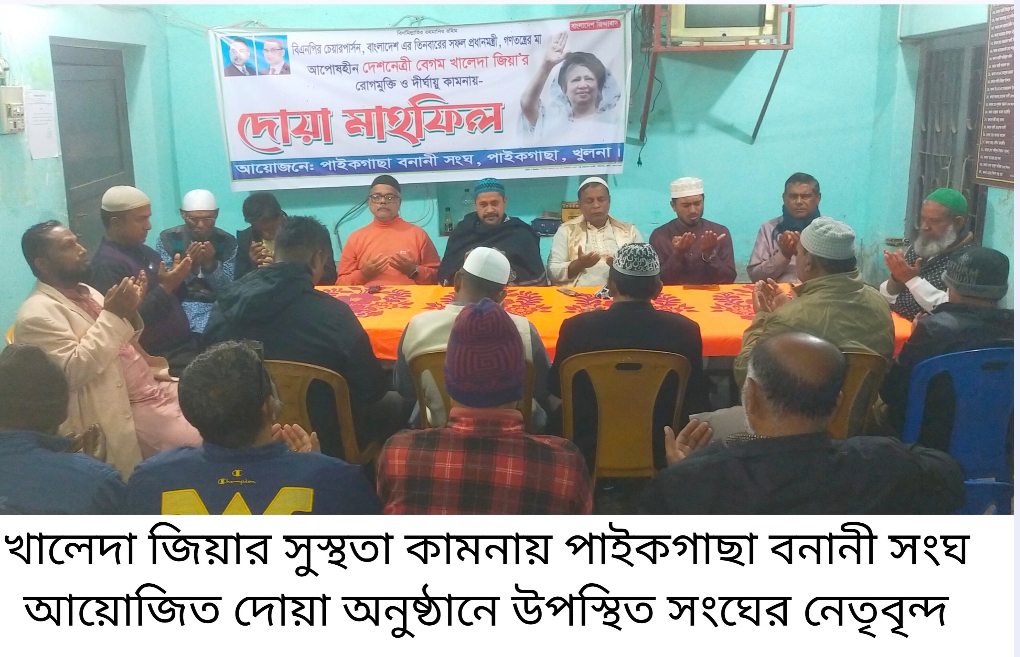 বেগম খালেদা জিয়ার সুস্থতা কামনায় দোয়া মাহফিল অনুষ্ঠিত হয়েছে। ৫ডিসেম্বর শুক্রবার সন্ধ্যায় পাইকগাছা বনানী সংঘ এ দোয়া মাহফিল অনুষ্ঠানের আয়োজন করে।