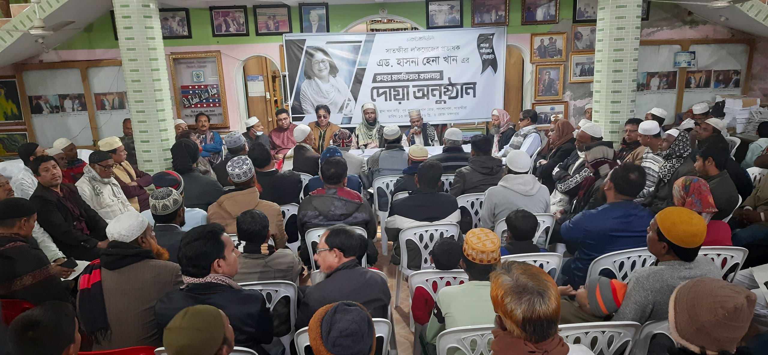 মঙ্গলবার (১৩ জানুয়ারি) বিকালে শহরের পলাশপোলস্থ খান বাড়িতে পরিবারের আয়োজনে এ দোয়া অনুষ্ঠানে মরহুমা এড. হাসনা হেনা খানের কর্মজীবনের স্মৃতিচারণ করে বক্তব্য রাখেন মরহুমার স্বামী সাতক্ষীরা ল কলেজের প্রিন্সিপাল ডক্টর রবিউল ইসলাম খান, মরহুমার একমাত্র সন্তান পিথার রবিউল খানসহ আত্মীয়-স্বজন ও শুভাকাঙ্ক্ষীরা বক্তব্য রাখেন।